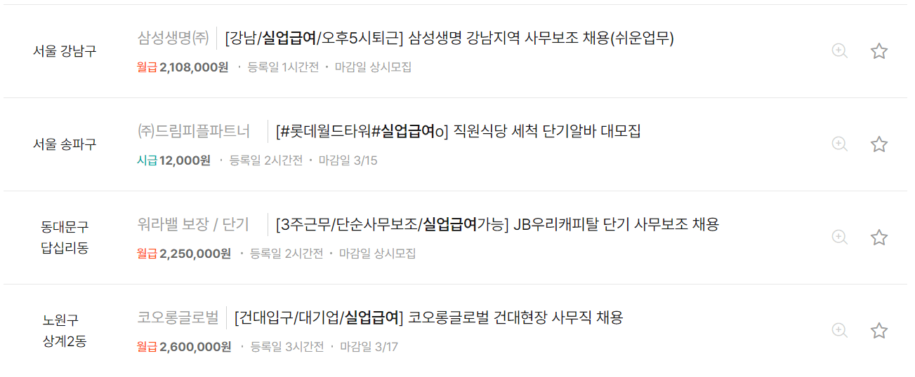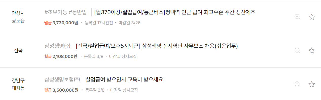 알바몬, 알바천국 등 구직 사이트에서 '실업급여 신청가능' 으로 광고하고 있는 아르바이트, 4대보험 가입이 가능한 단기계약직 일자리에서 1개월 이상만 일하면 실업급여 받을 수 있습니다.
